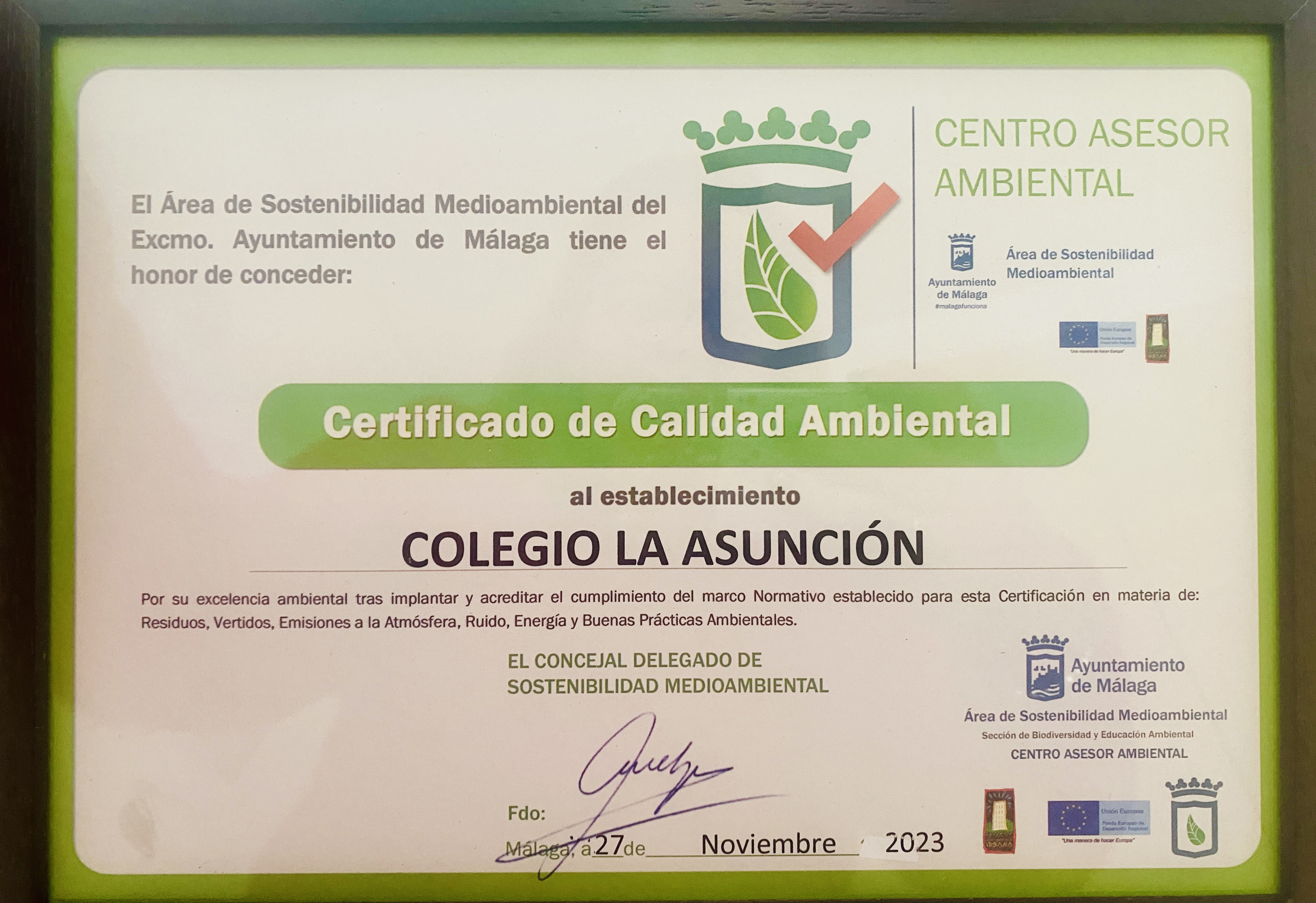 El Área de sostenibilidad Medioambiental del Ayto. de Málaga ha otorgado al colegio el certificado de Calidad Ambiental. por el programa de excelencia medioambiental que se lleva a cabo en el centro.