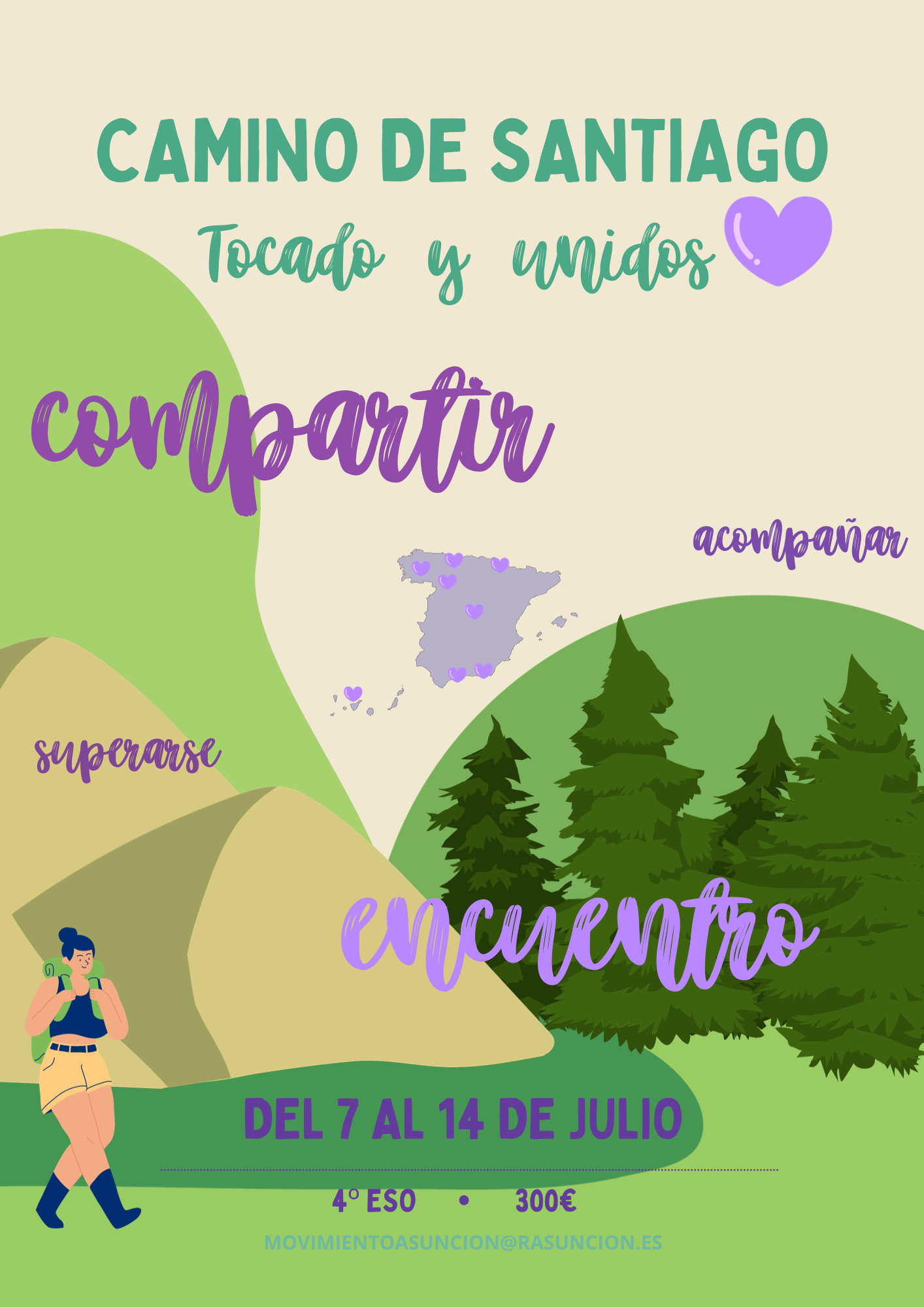 CAMINO DE SANTIAGO: como en otras ocasiones, este verano se realizará el llamado Camino Francés. Se comenzará en Sarria el día 7 de julio y concluirá en Santiago de Compostela el día 14. Esta actividad va dirigida a jóvenes de 4º ESO de los diferentes lugares de España, de los diferentes Colegios e Inserciones de la Asunción. El alojamiento será en Sarria y Santiago. El precio total de la actividad es de 300 €, sin incluir viajes. El plazo de inscripción estará abierto hasta el 1 de febrero. Se realizará con la persona responsable del colegio o inserción. Junto con la ficha de datos que se adjunta, será necesario abonar 45€ en concepto de matrícula que se descontarán del precio total de la actividad.