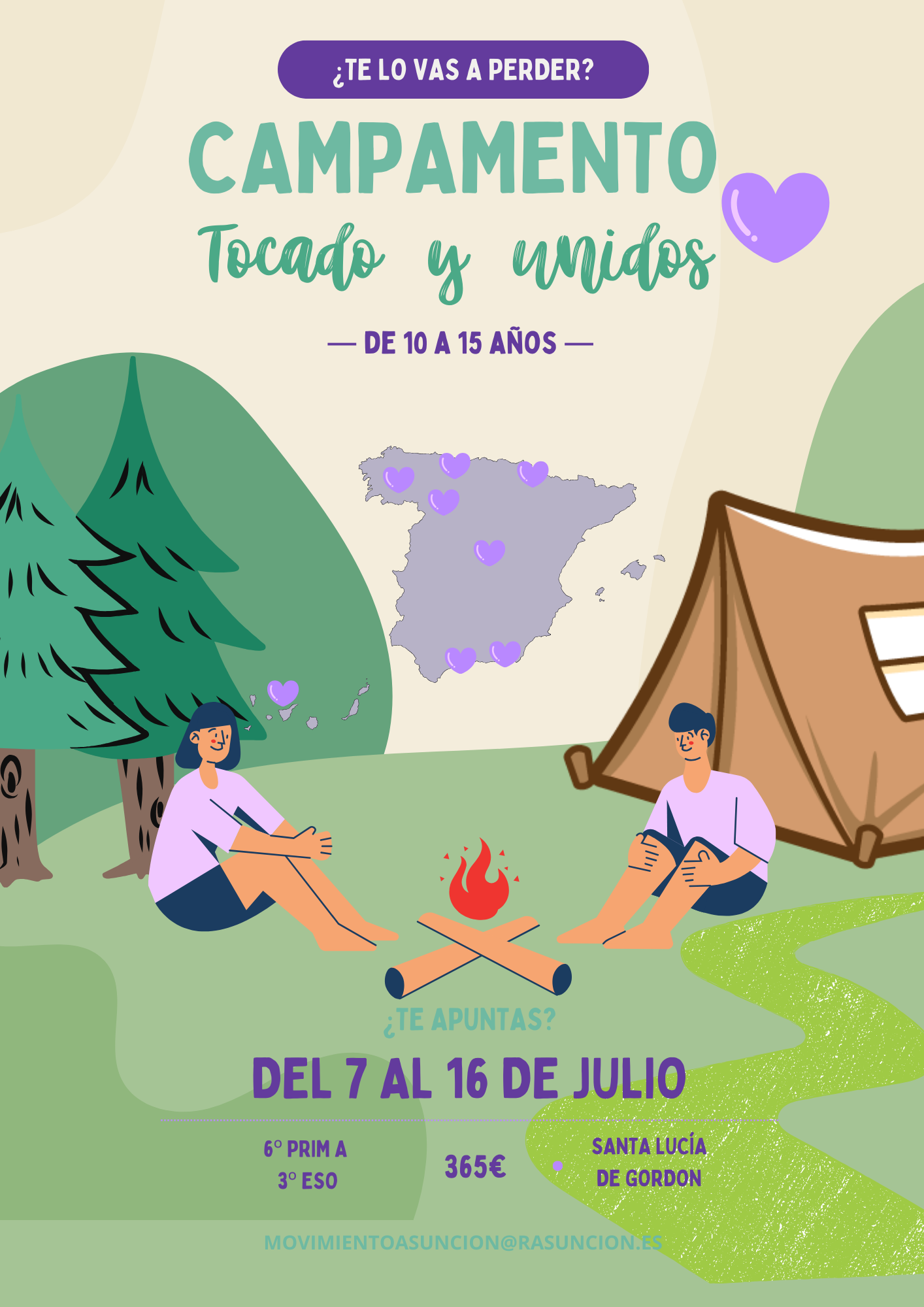 CAMPAMENTO: Ofrecemos la posibilidad de disfrutar en la naturaleza con otros chicos y chicas a través de talleres, juegos, marchas, dinámicas divertidas, reflexiones y oraciones. Asistirán jóvenes de diferentes puntos de España de 6º de Primaria hasta 3º de la ESO. Tendrá lugar entre los días 7-16 de julio en centro de turismo La Galería en Santa Lucía de Gordón (León). El precio de la actividad será de 365 €, sin incluir viajes. El plazo de inscripción estará abierto hasta el 1 de febrero. Se realizará con la persona responsable del colegio o inserción. Junto con la ficha de datos que se adjunta, será necesario abonar 50 € en concepto de matrícula que se descontarán del precio total de la actividad.