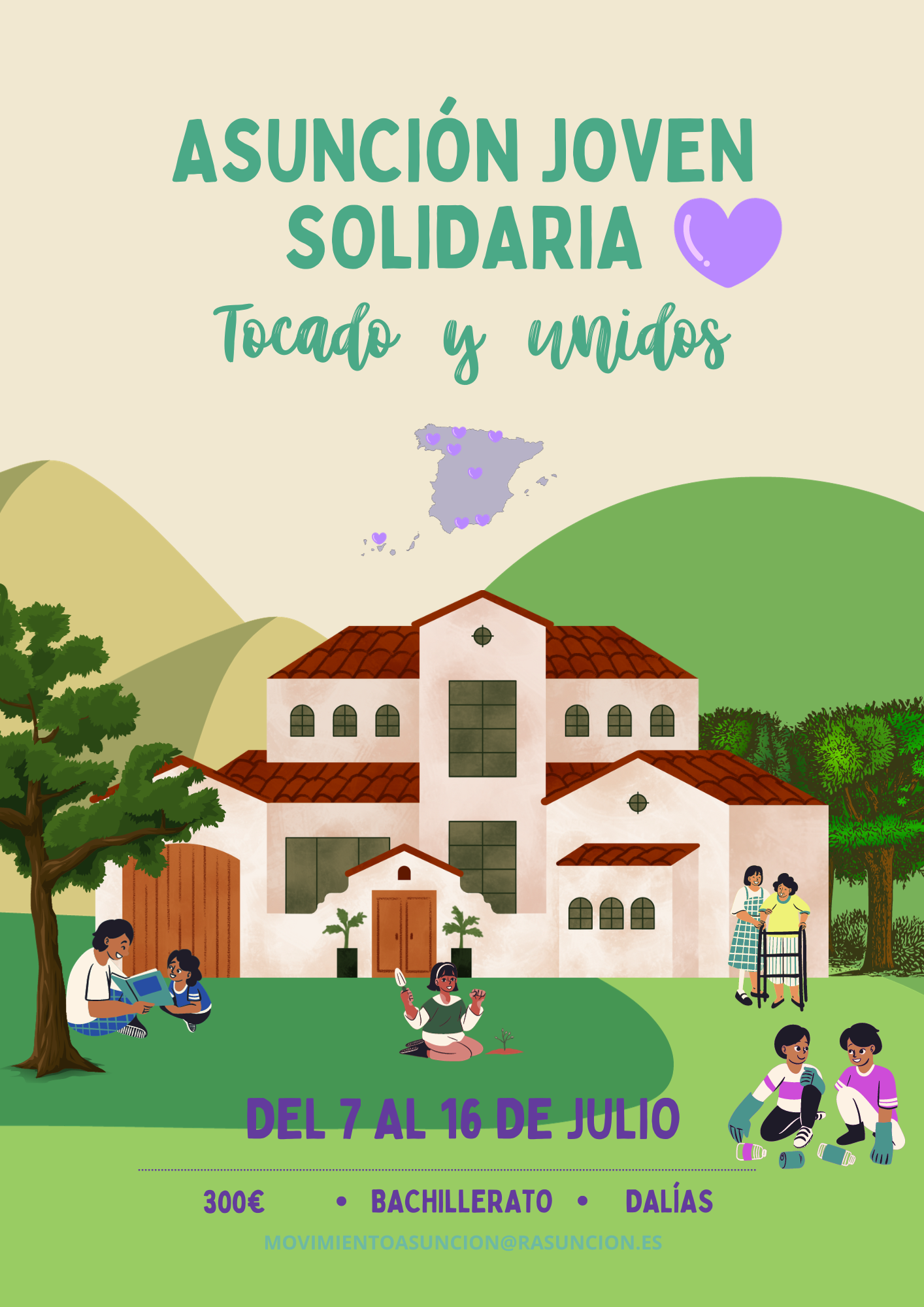 ASUNCIÓN JOVEN SOLIDARIA: esta actividad tiene un doble objetivo: - Comprometerse con la realidad, descubriendo distintos voluntariados en el entorno y realizando con los más pequeños un campamento urbano. - Crecer como creyentes haciendo una relectura de la vida desde el Evangelio. Esta actividad va dirigida a chicos/as desde 1º de Bachillerato. Se llevará a cabo del 7 al 16 de julio en Dalías, un bello pueblo situado al pie de la Alpujarra almeriense donde vive habitualmente una comunidad de la Asunción. El precio es 300 €, sin incluir viajes. El plazo de inscripción estará abierto hasta el 1 de febrero. Se realizará con la persona responsable del colegio o inserción. Junto con la ficha de datos que se adjunta, será necesario abonar 40 € en concepto de matrícula que se descontarán del precio total de la actividad.