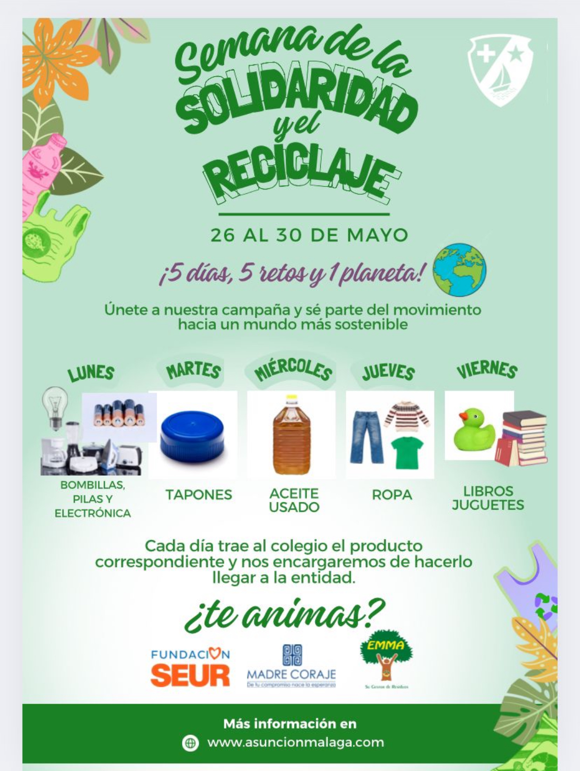Del 26 al 30 de mayo, nuestro colegio celebrará una iniciativa muy especial: la Semana de la Solidaridad y del Reciclaje, bajo el lema "¡Cinco retos, cinco días y un planeta!". Esta campaña busca fomentar el compromiso con el medio ambiente y la solidaridad a través de una gran recogida de materiales reutilizables y residuos, que serán entregados a organizaciones con las que colaboramos habitualmente: Fundación SEUR, EMMA y Madre Coraje.