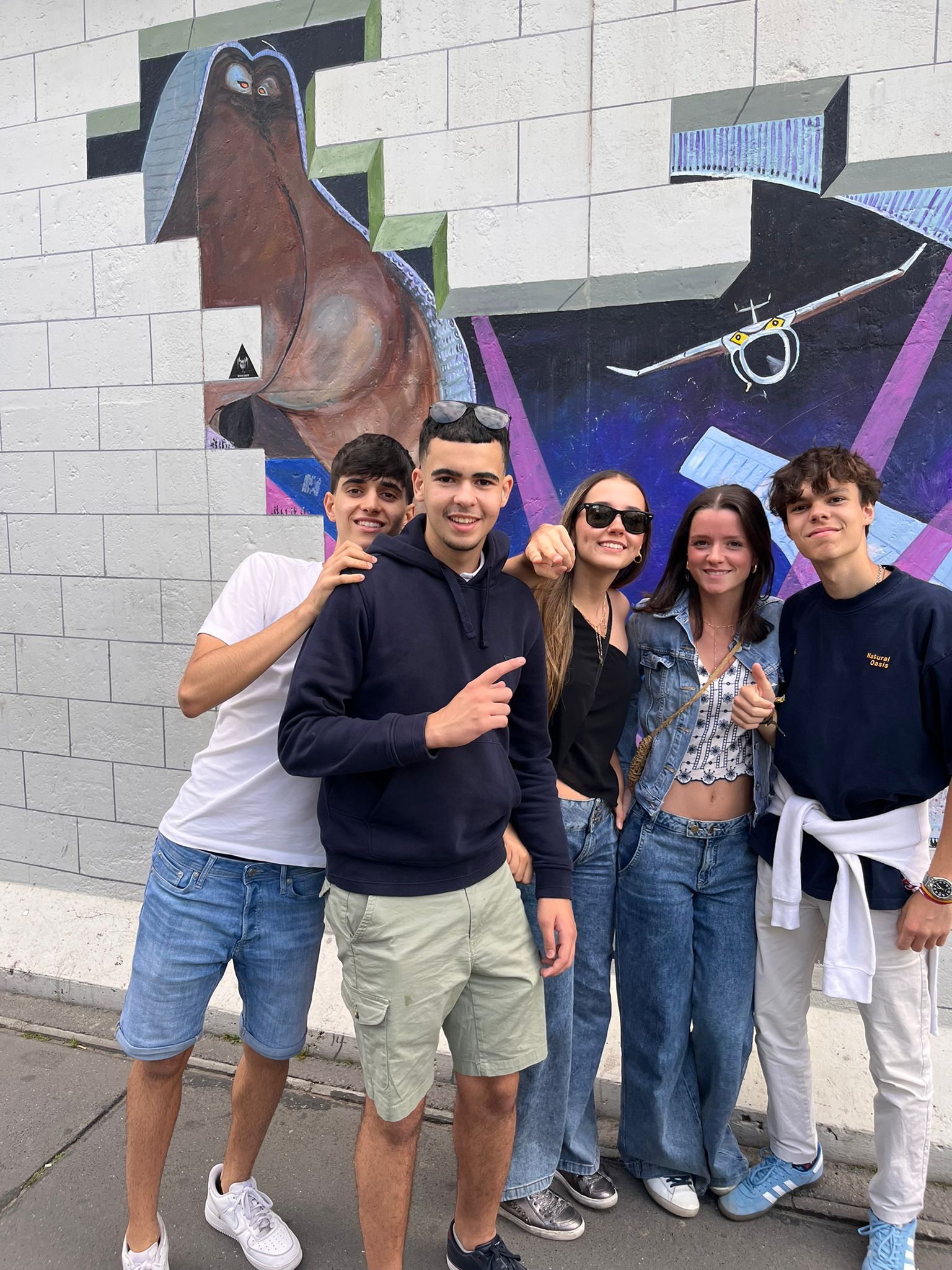 El recorrido comenzó con una visita guiada al East Side Gallery, un tramo del antiguo Muro de Berlín a orillas del río Spree. Este lugar, convertido en galería de arte al aire libre, está lleno de impactantes murales que invitan a la reflexión. Uno de los más fotografiados por nuestros alumnos fue el famoso "Beso fraternal socialista", símbolo de una época marcada por la división.