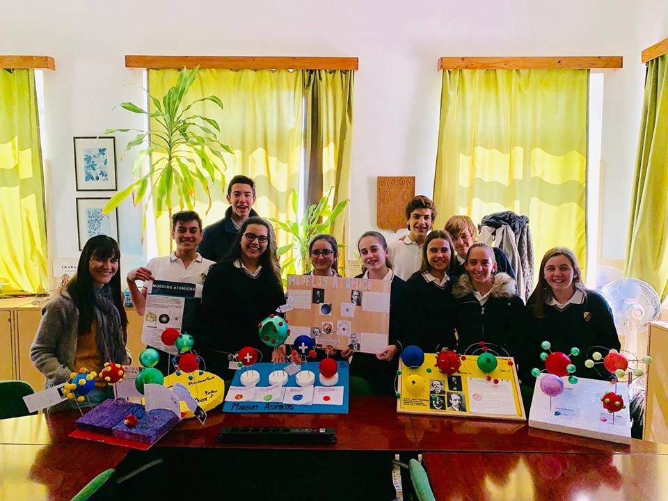 Alumnos de segundo de ESO con una pequeña representación de las maquetas de modelos atómicos realizadas en clase.