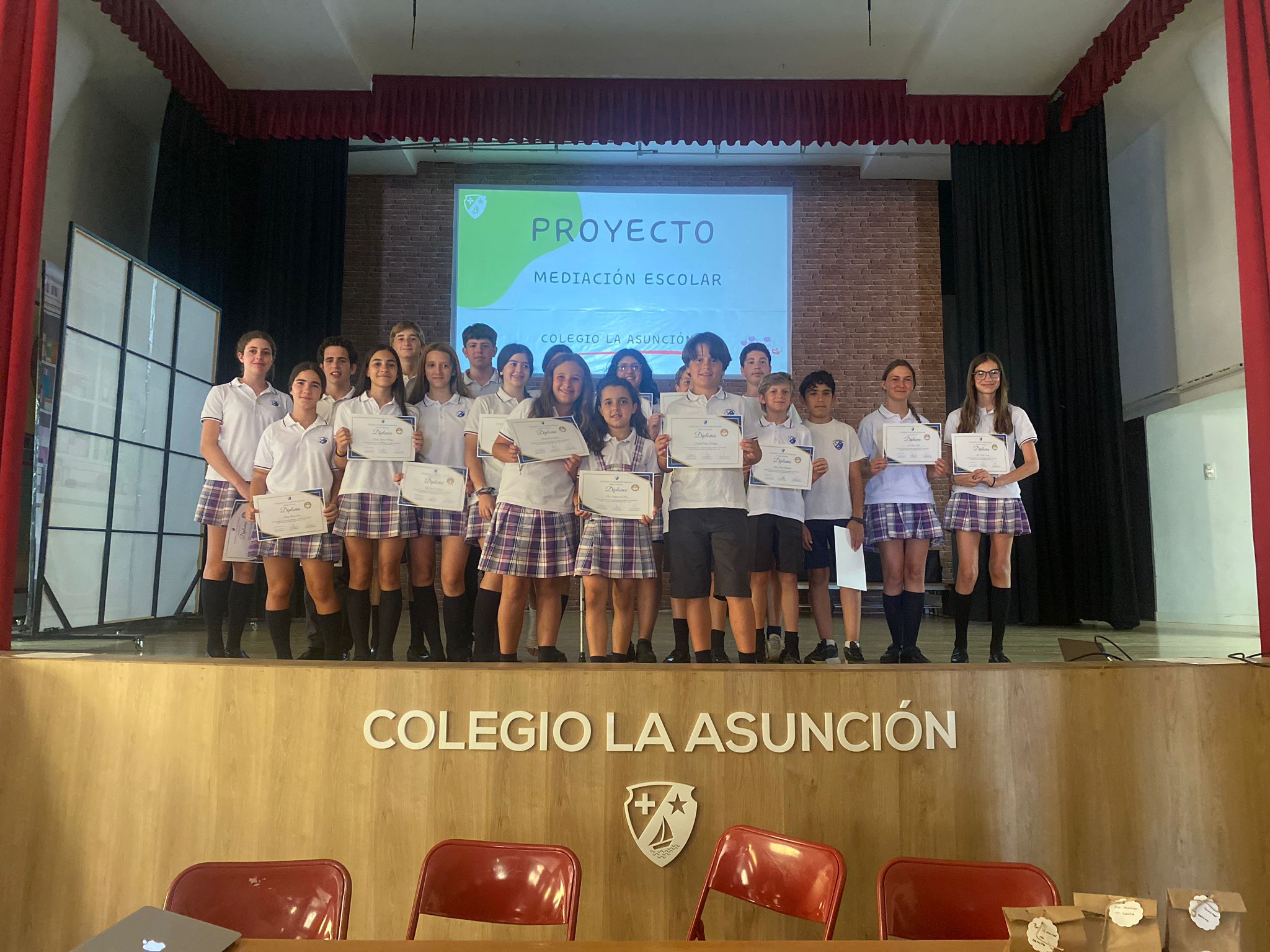 Un grupo de Mediadores Escolares de primaria y secundaria, elegidos por sus compañeros se han formado este curso escolar para ser mediadores escolares de su etapa escolar. El pasado 10 de junio fueron reconocidos sus compromisos con la convivencia escolar, donde se les hizo entrega de un diploma por su trabajo en presencia de sus familias.